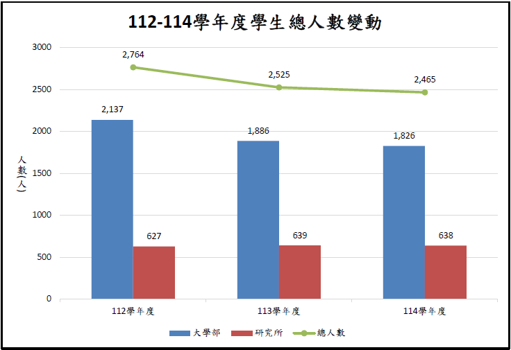 在臺灣地區高等教育少子化嚴重衝擊之下,本校學生總數112學年度為2,764人,大學部2,137人、研究所627人;113學年度為2,525人,大學部1,886人、研究所639人;114學年度為2,465人,大學部1,827人、研究所638人。由下面趨勢圖可知,近三年間大學部學生數呈下降趨勢,研究所學生數微幅上升。惟,大學部下降比率較多(每年約10-15%),故總學生數呈下滑趨勢。但我們仍對未來抱持信心,以維持3,000人以上之學生數為目標,並持續開拓境外生及全齡生生源。