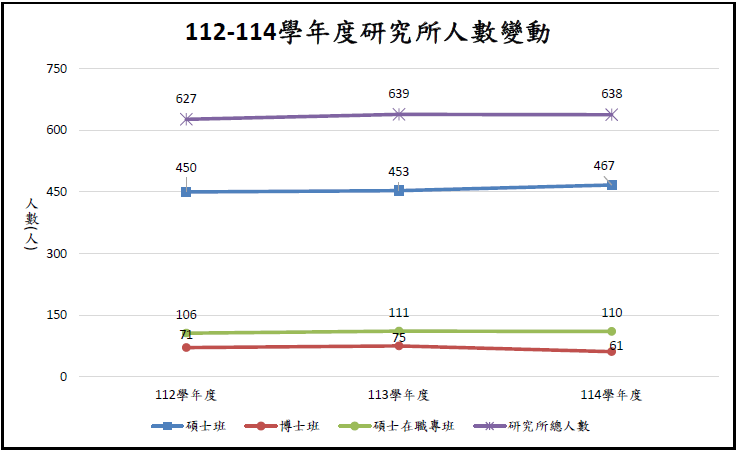 本校自114學年度起協助安置大漢技術學院學生。本校近3年(112-114)大學部(114學年度含花蓮大漢專班)、研究所、碩士班、碩士在職專班與博士班人數如下表。