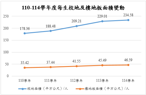 | 校地面積(平方公尺)/人 | 178.36 | 188.48 | 209.21 | 229.01 | 234.58 |