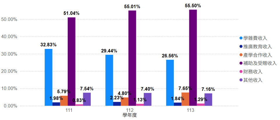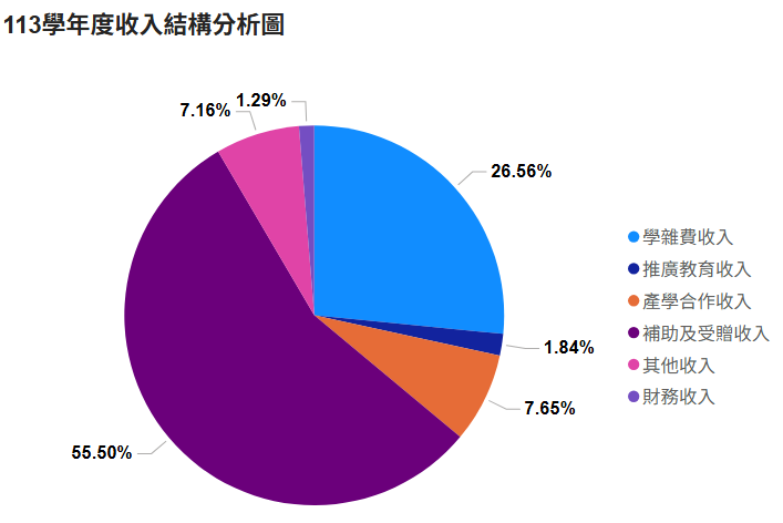 3.政府補助收入方面,本校辦學績優,獲得教育部獎勵校務發展計畫、高教深耕補助計畫等,得以 持續改進教學環境與品質。